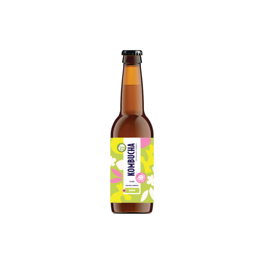 Lekko gazowany napój na bazie grzybka herbacianego scoby oraz sfermentowanej zielonej herbaty z dodatkiem soku z imbiru.